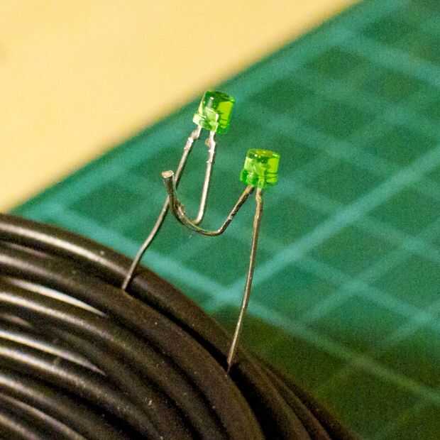 Cuadro 1: Empezar con soldar los leds conectados en serie. Tenga en cuenta que los leds tienen un lado"plus" (ánodo) y un lado"negativo" (cátodo). Con más leds, el plomo del ánodo es un poco más largo que el cátodo. Para conectar los leds en serie, suelda el ánodo de un led al cátodo del led.