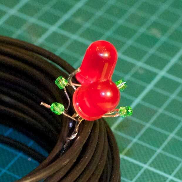 Cuadro 2: Todos los leds soldados juntos, haciendo la flor led. Dos pares de leds verde de 2mm y un par de leds de 10mm de color rojo están conectados en paralelo (paralelo significa que los lados más de los pares de led están conectados y los lados menos de los pares de led).
