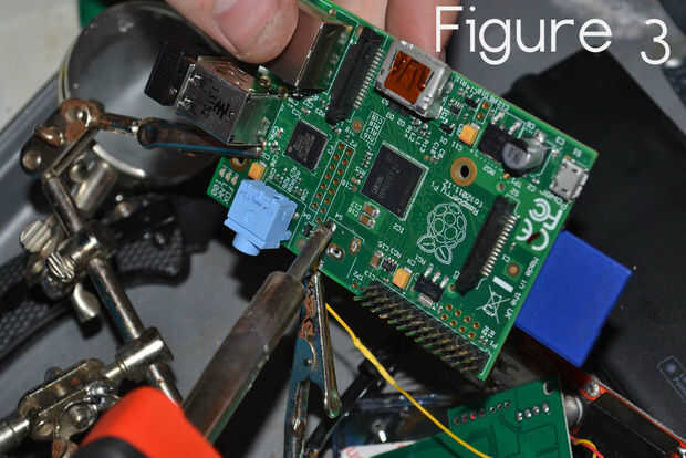- Desoldar los 3 soportes en el bajo lado del Raspberry Pi. Utilice la figura 2 como referencia.