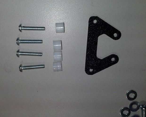 Paso cuatro (4) #6-32 x. 5" tornillo de la placa de retención del cinturón. Luego, coloque una arandela,. 25" espaciador y una arandela en cada tornillo. Coloque este conjunto en el cuerpo del carro.