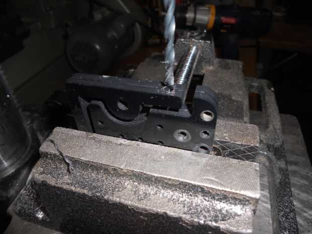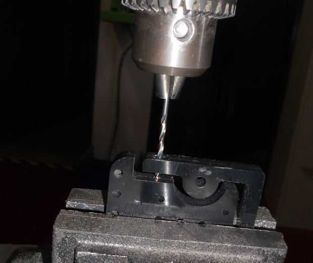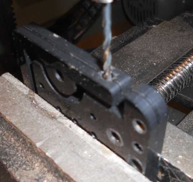 Ahora toma la broca #43, pase por el orificio en el brazo y en el cuerpo del carro del taladro (ver fotos). Toque el agujero #43 con un toque de #4-40.