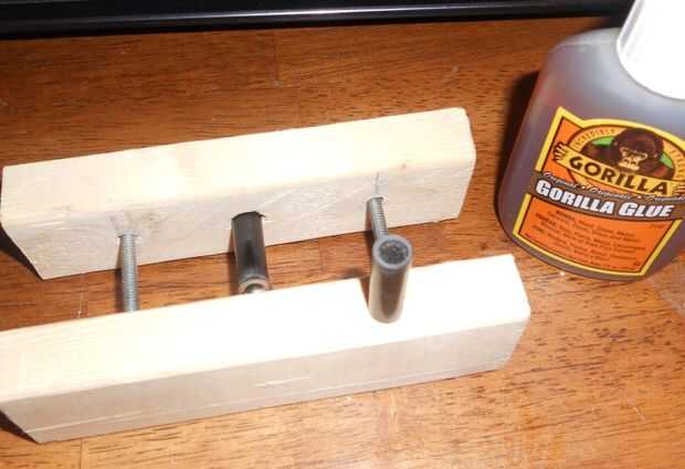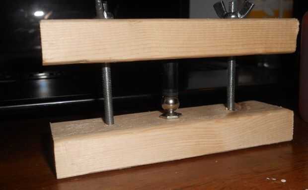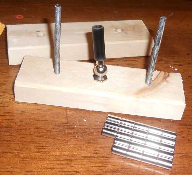 Para hacer la plantilla del conjunto taza bola, haz dos tiras de mdf o madera de 1" de ancho, 3" de largo y 1/2" de grosor. Perfore un agujero de #43 en el centro de uno de ellos - se trata de la parte inferior. Apilar las dos piezas de madera y dos 9/64" agujeros igual distancia de cada extremo del taladro. Tomar la pieza superior de la madera y agrandar los orificios con un 5/32" bits. Tomar dos varillas #8-32 roscada y pase a través de los orificios de 9/64" de la pieza inferior. Tomar una rótula que había reservada y colócala en el orificio central.