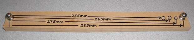 la segunda plantilla es una pieza de mdf que es 310mm de largo. Perfore un agujero de #43 en un extremo y otro 285mm de distancia. Hacen uno de los agujeros ligeramente gran tamaño para que el conjunto husillo se deslizará perfectamente sin necesidad de atornillar. NO hacen el agujero tan grande que la rótula puede tambalearse. La rótula tiene que deslizarse en apretado. Tomar una de las articulaciones de bola y atorníllelo en el otro agujero.