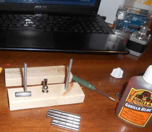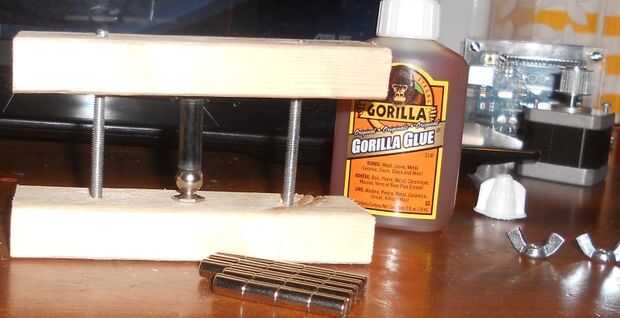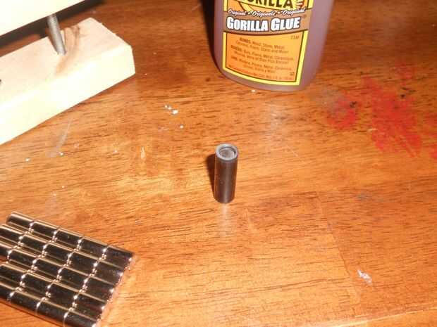 Para montar los extremos magnéticos con la bola de tazas conjuntas pegan un imán en la rótula. A continuación aplique cuidadosamente una fina capa de pegamento gorila dentro el tubo asegurándose de no conseguir cualquier pegamento en el borde del tubo - aplica el pegamento aproximadamente 1/16 de pulgada del borde. Asegúrese de seguir las instrucciones del pegamento gorila (agregar humedad a las piezas). Deslice el tubo sobre el imán y la prensa contra la rótula. Fije la parte superior de la plantilla y apriete con la tuerca de mariposa. Espere a que el pegamento se seque durante 1-2 horas. Repetir once veces más. Después de su fabricación hecho estos quitar la rótula y apartar.
