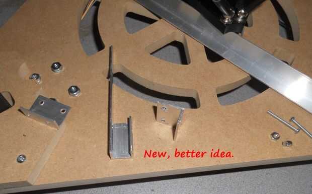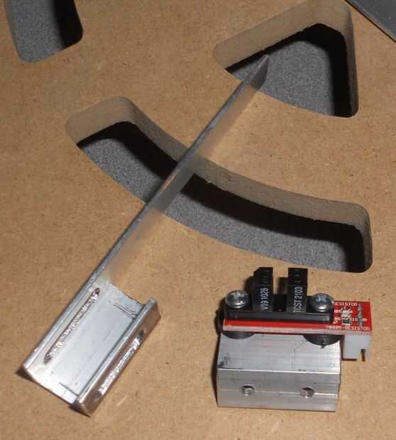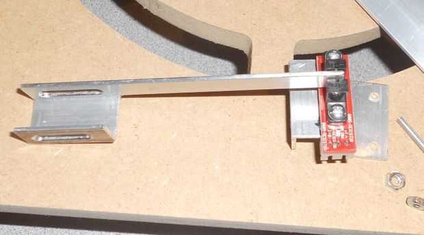 Primero compra una extrusión de aluminio L-bar de la tienda de hardware que debe ser la dimensión de L 1 "x 1/2". Corte tres secciones de 1". En la mayor marca superficial y perforaciones para montar el sensor de parada final con una 1/8" pedacito de taladro. Taladre dos agujeros más en la superficie del aluminio de 1/4" de los bordes. Coloque los sensores en los ángulos con #4-40 tornillos y una tuerca. Puede ser necesario usar espaciadores de nylon de 1/8" para que la placa de circuito no un cortocircuito en el aluminio barra L.