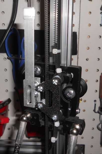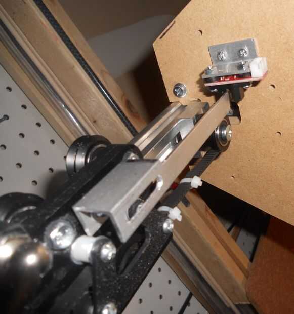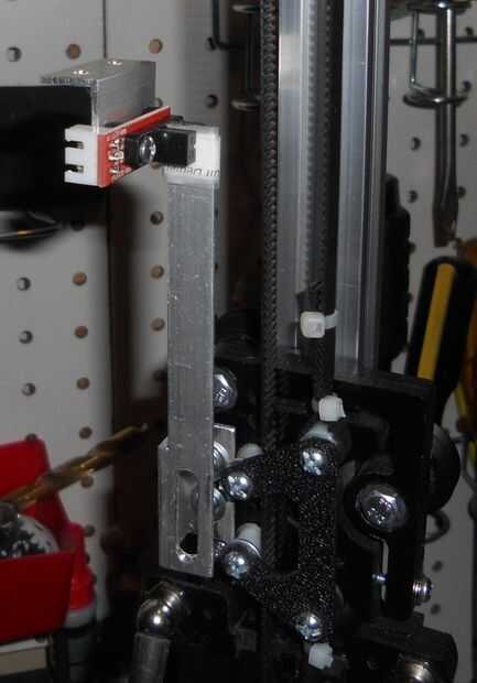 Envuelva la cinta alrededor de la extremidad de las banderas de parada final en el carro para que los sensores ópticos pueden encajados en la bandera. Si es necesario, el sensor a la bandera para mantener segura la cinta (ver foto). Levantar el carro para que el aluminio L toque la parte superior de la impresora. Marque los orificios y perfore con una broca de 1/8.