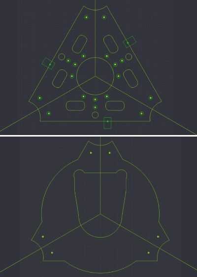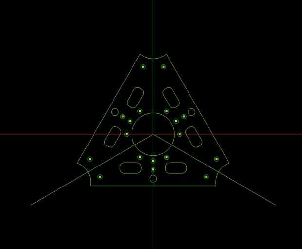 El efector final es un triángulo equilátero como la base, sólo mucho más pequeño. El diseño tiene un agujero en el centro de la boquilla del extremo caliente. en los lados son seis juntas de bola de acero.