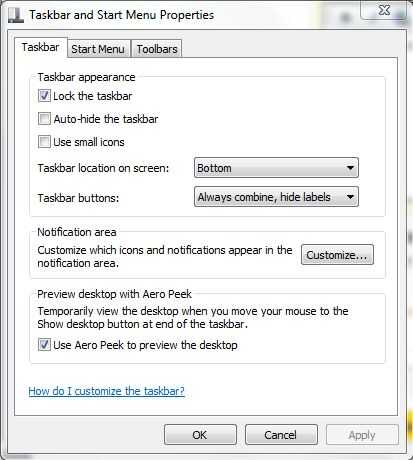 Haga clic derecho en la barra de tareas y entrar en sus propiedades. La casilla usar iconos pequeños. Configurar botones de la barra de tareas nunca combinar. Estos ajustes se aplican y usted debe conseguir una barra de tareas más o menos como de Vista.