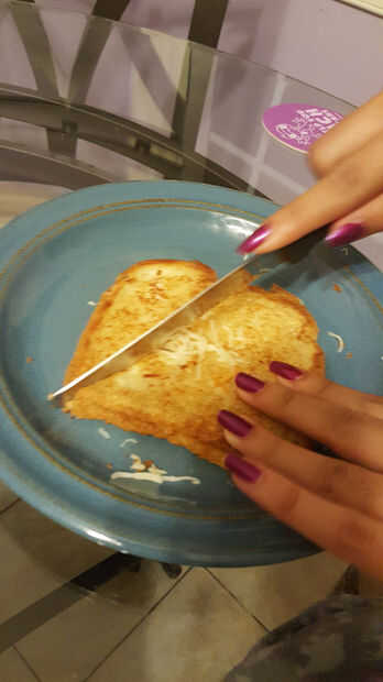 producto terminado!Paso 1: Se reúnen 2 rebanadas de pan, 2 rebanadas de queso, mantequilla, cuchillo, sartén, espátulaPaso 2: Poner pan en la estufa.Paso 3: Encender la hornilla, a fuego medio.Paso 4: Tomar 2 rebanadas de pan, ponerlo en la placa de