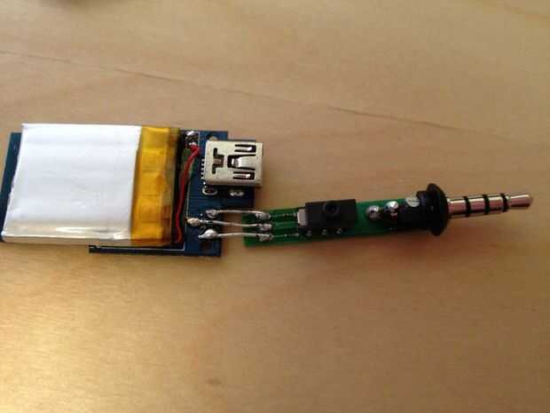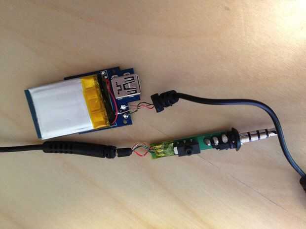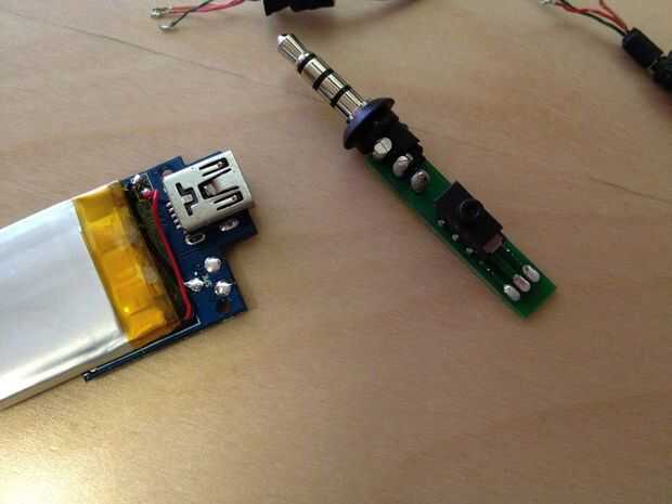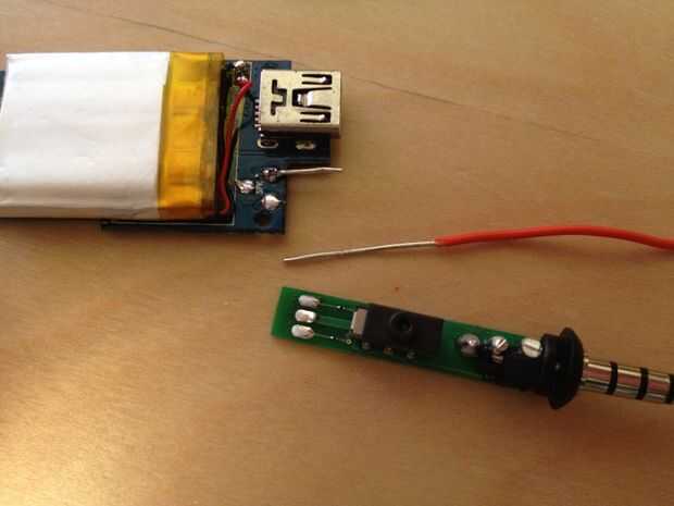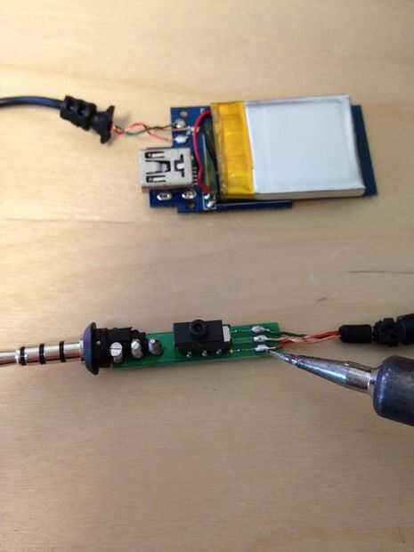 Una vez se desoldar todos los cables, es hora de utilizar el cable de núcleo sólido de 22 calibre para las dos partes juntas. Cortar 3 x 0,5" tiras de alambre. Algunos soldadura se aplican a ambos extremos de cada alambre y luego de la soldadura para el dongle bluetooth primero (el dongle bluetooth es más estrecho). Suelde todos los 3 cables para el dongle bluetooth primero. Una vez hecho esto, suelde el otro extremo al conector de 3,5 mm como se muestra en la imagen.