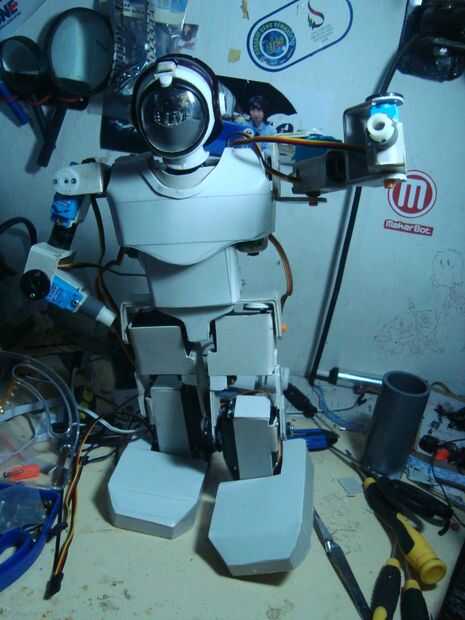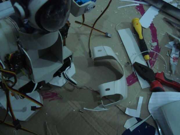 bien ahora tenemos la cabeza y bodi, pieza de la pierna y parte de la mano, unir todo con un pegamento fuerte o tornillo seguro. hacer un soporte de la batería en el cuerpo. más goog parecen alguna cubierta para el pie y el cuerpo utilizando flatt pvc, la forma del diseño desea con el poco fuego y trabajo manual.