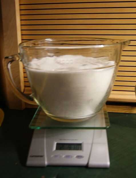 A continuación pesar 2 1/2 libras de azúcar blanca. Para este Instructable, hice una medida de volumen y consiguió 6 tazas. Esto produce un vino seco. Con más azúcar no aumentará el contenido en alcohol del vino, sólo hará más dulce. Otro cuarto de libra de azúcar producirá un vino medio; otra mitad-libra producirá un vino bastante dulce. En un vino seco, todo el azúcar se convierte en suficiente alcohol para matar la levadura y detener la fermentación. La mayor cantidad de azúcar simplemente quedarse en el vino como las paradas de fermentación. Se puede sustituir la azúcar orgánica si es un vino dulce o medio, ya que consumir azúcar en el vino acabado.