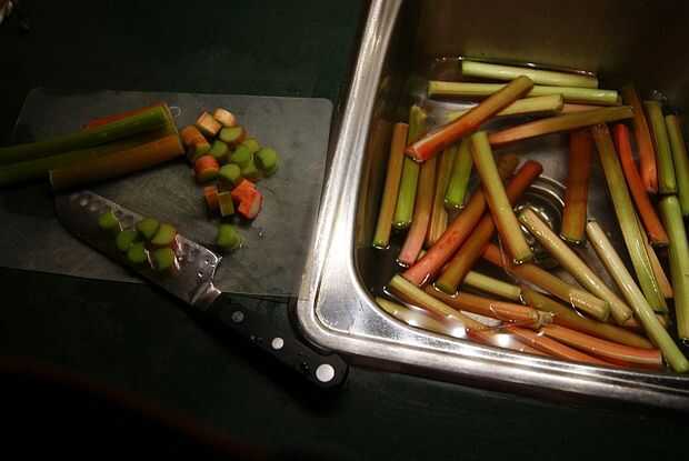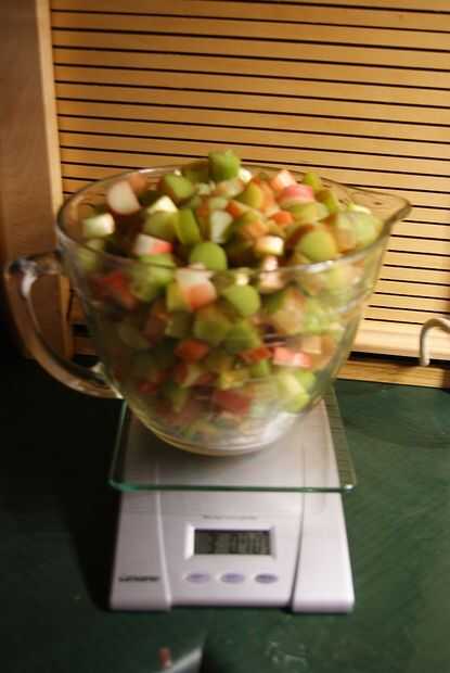 Tengo una báscula digital que tiene una función de Tara: puedo poner un bol u otro recipiente en la balanza, encienda la balanza y registra un peso de cero. Pica y agregar ruibarbo al contenedor hasta que el peso se registra como tres libras. Un poco sobre o bajo no importa. Si usted no tiene una escala, asegúrese de que tiene media pulgada rodajas y mida tres cuartos en el recipiente grande.