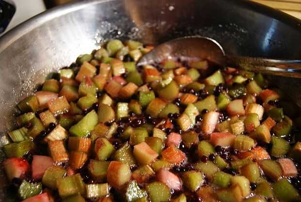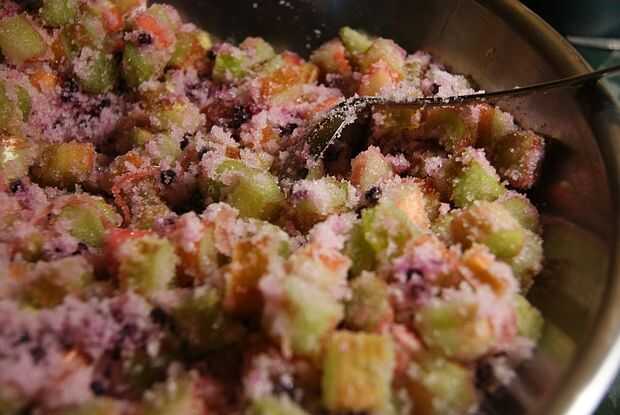 En realidad es extraer un jarabe, puesto que se utiliza tanto azúcar. Combinar el ruibarbo cortado, bayas y el azúcar en un tazón grande. Cubrir (ya que no quieres encontrar esto y a partir de un desfile de hormigas!) y deja reposar durante 24 horas. Revuelva cada 4 horas o así, sobre todo para animar a todo el azúcar se disuelva en el jarabe.
