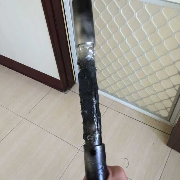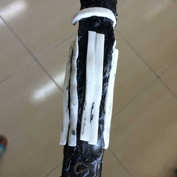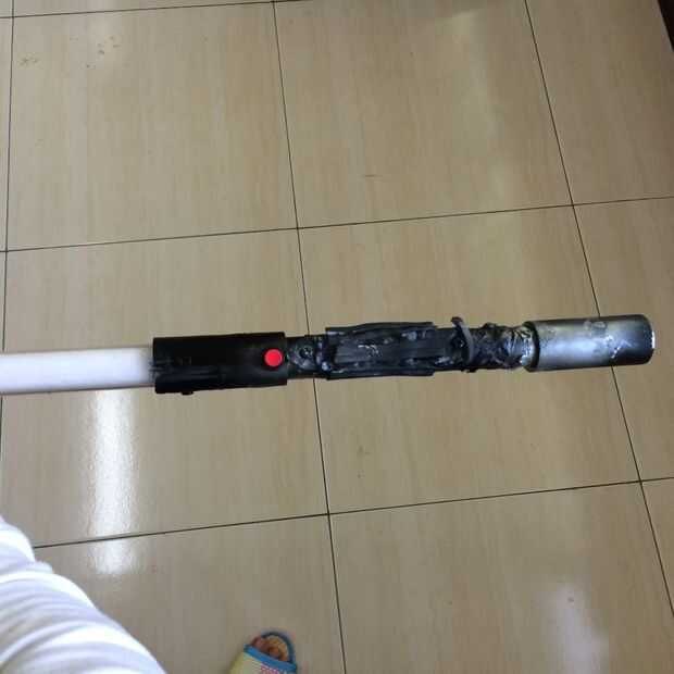 Para empuñadura de sable es más complicado. Y porque mi plástico de la pipa es un poco pequeño así cortar alguna parte de mi soporte de la batería. También de tornillo un agujero para poner en mi switch. Además corté una parte de la tubería de plástico de origen ponerla con un pice de acrílico para hacer una tapa de la batería. Así que puedo cambiar la batería cuando agota. Para hacer las cachas de la empuñadura más confortable puso unos de espuma en la empuñadura. También tengo cristal de forma de uso para la decoración (Ya ves no tengo talento de arte). Entonces el paso final es de color, lo que opté por usar pintura en spray (yo uso negro y plata para este).