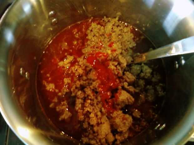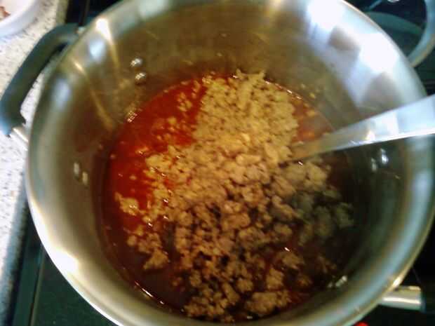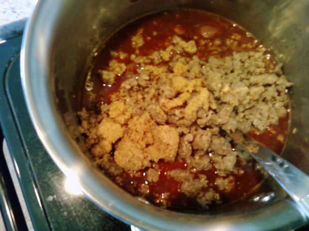 Vierta la lata de tomates, la carne, el azúcar moreno y tanto la salsa como en la olla grande y revuelva. Devolver la mezcla a fuego lento bajo, cubierta y reducir a fuego medio.