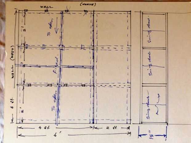 El plan es tener cuatro contenedores de almacenaje grande adyacentes a las paredes con tapa-apertura puertas (como el capo del coche) y tres armario como almacenamiento de información en el frente con puertas de apertura hacia el exterior. Artículos que no están en uso frecuente pueden ir en que contenedores de almacenaje grande. Otros artículos con frecuencia usados se pueden almacenar en frente para de fácil acceso.