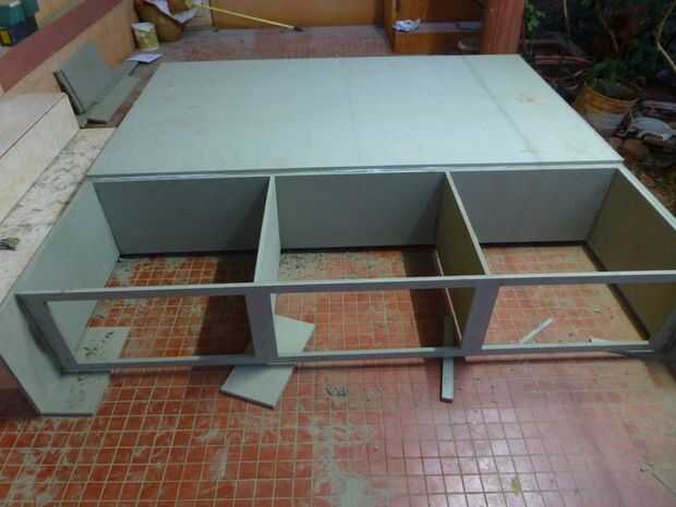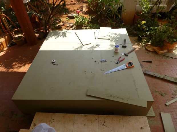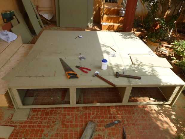 La zona inferior a cubrirse es exactamente 6 pies por 6 pies (36 pies cuadrados). No tenemos una sola junta de ese tamaño, así que utilizamos una pieza de 6 pies por 4 pies, que cubre los contenedores de almacenaje grande y otro pedazo de tamaño 6 pies por 2 pies, que cubrirá los armarios frontales.