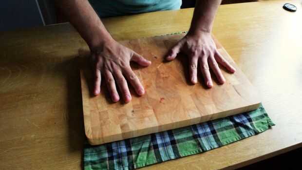 Volver a poner el tablero de corte en la parte superior de la superficie regada. Empuje hacia abajo y le pega a la mesa.