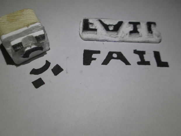 Por lo que es mi diseño para hacer algunos sellos condescendientes, o un sello con lo que le mensaje. Todo lo que queda ahora es poner algunos tinta en ella. Esto puede hacerse con una almohadilla de tinta o colorante directamente en el sello con un rotulador. Además, tengo la idea de usar una goma de borrar como el sello cuando recordé descubrir que una goma de borrar podría ser utilizado como un sello para colorear sobre el borrador con un bolígrafo y estampar sobre un papel. Es un truco, y usted puede intentarlo en clase o en su escritorio.