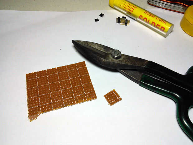 Corte simplemente una fracción de la tabla de perf. El mío es 4 x 4 (conteo de la agujeros) ya que estoy lidiando con un chip de 8 pines SMD.