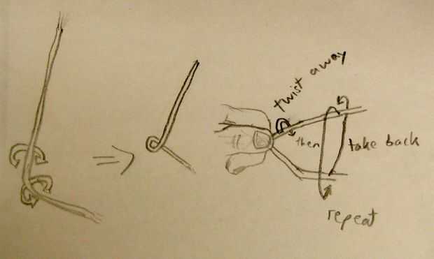 Alrededor de un cuarto del camino a lo largo de la hebra, gire un segmento corto en direcciones opuestas para formar un bucle ajustado. (Gire hacia a la derecha, hacia la izquierda.) El sujetador de este bucle con el pulgar y el índice.