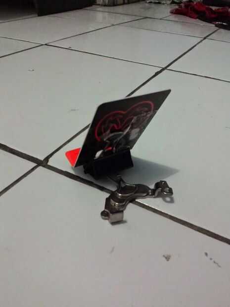 1. preparó un clip de papel y una tarjeta sim antigua que pegamos, pegar antes en los pliegues dan aproximadamente 1cm (según el grosor, el HP) dar cierta distancia poco MM, porque HP es actualmente almacenado en el soporte estará ligeramente inclinada. Como la imagen de abajo, usar cinta adhesiva para menggabungkan'nya. Para que el titular no está demasiado sesgado cuando esté en uso, a continuación, utilizar una pequeña cuña entre la sim correcta y la abrazadera.