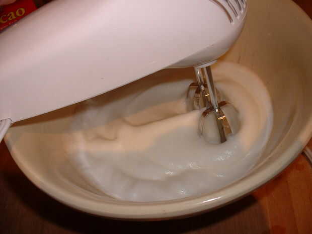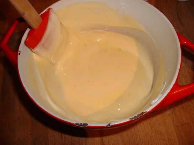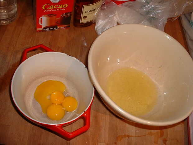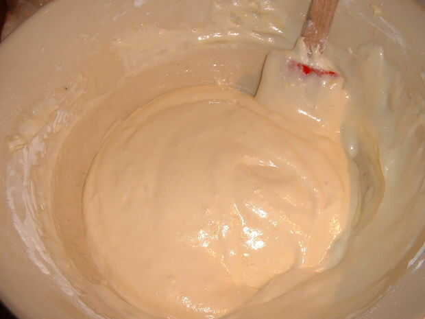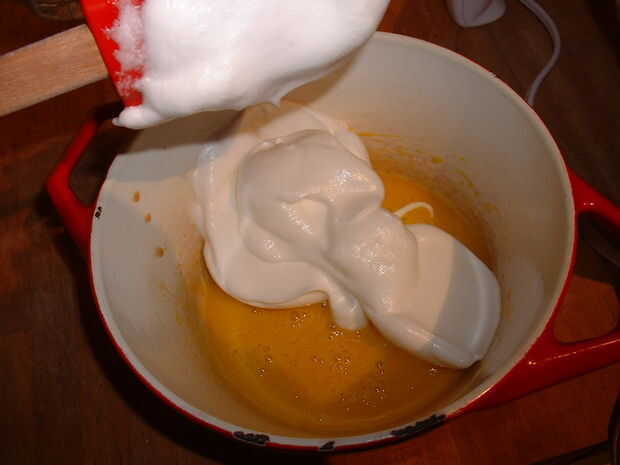 5. Añadir 1/4-1/3 de las claras a las yemas e incorpore suavemente hasta que quede un color uniforme.