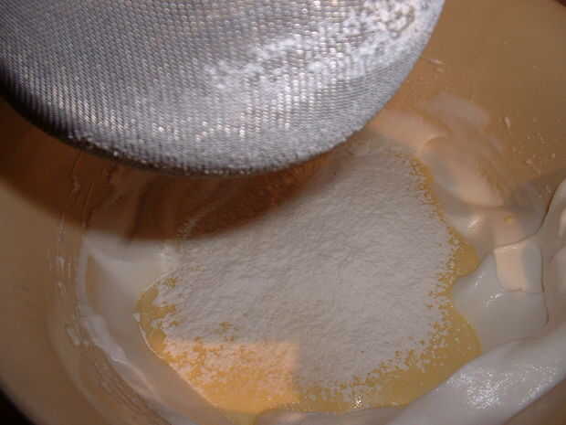7. tamizar la harina y la maicena juntas sobre la mezcla.