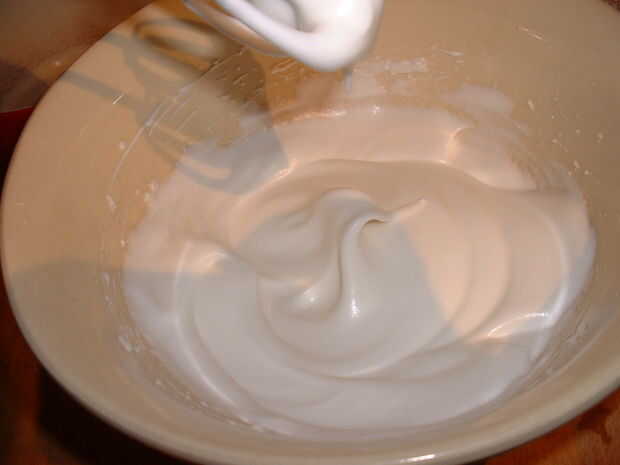 2. bata las claras con una pizca de sal hasta que se formen picos suaves.