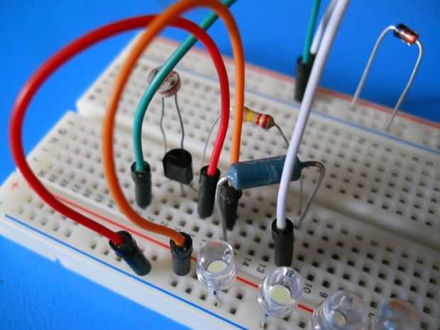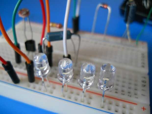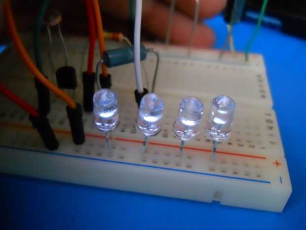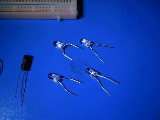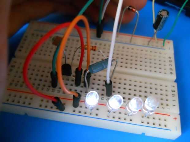 Para las pruebas he usado una fuente de alimentación de ladrón de joule pero en mi moto funciona con 4 pilas AA. Si la luz según resitsor "siente" oscuridad el circuito comienza a trabajar. He el prototipo en un protoboard utilizando 4 LEDs pero en los dos pasos siguientes te mostraré cómo insertar este circuito en la luz de la bici.