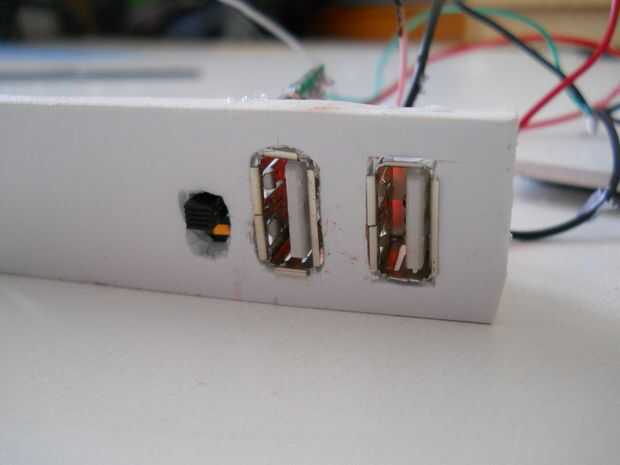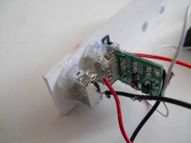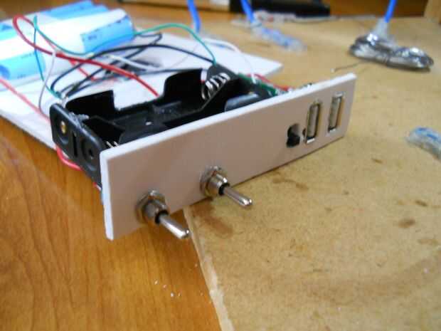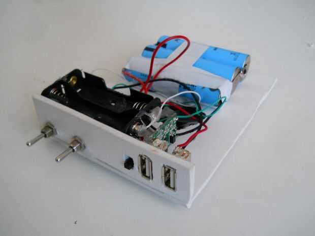 Usando su cuchillo o cortador corte un pequeño pedazo de plástico. Obtener la herramienta giratoria o perforar y hacer todos los agujeros de la "interfaz de usuario". Dos agujeros de interruptores y dos orificios para las salidas USB. Entonces usando la pistola encoladora se soluciono todo. Prueba de la cirtcuit a veces durante el trabajo. Si todo funciona utilice un pegamento y unir las partes. Al final probar el dispositivo con su teléfono.