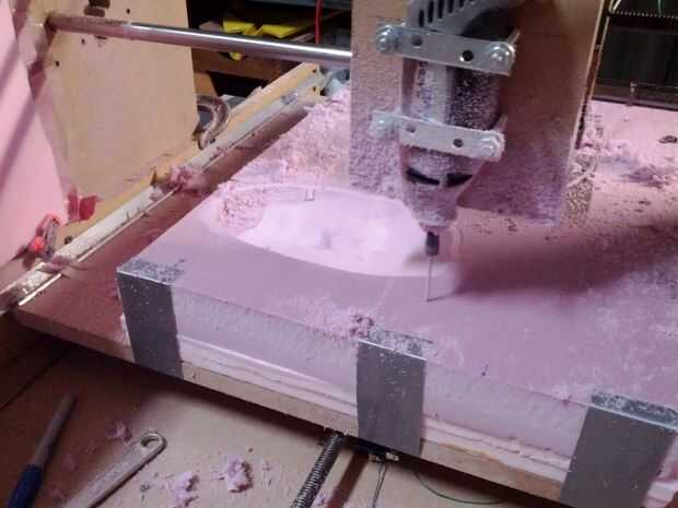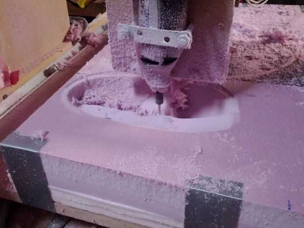 Un truco final. Freemill no era sofisticado suficiente para cortar el molde por capas. Sólo se cortan todo el camino hasta mi nariz en una sola vez. Este es un problema ya que tengo 3" largo del pedacito. Tengo este problema mediante la reducción de un par de veces pero con diferentes escalas de Z. Esto le permitió labrarse poco a poco el molde. Es importante comprobar que el eje z no golpeó la parte superior de la espuma al cortar todo el camino. Afortunadamente la cara es una curva suave, por lo que la dremel sí mismo (mi router para espuma) no golpee la espuma cuando se corte.