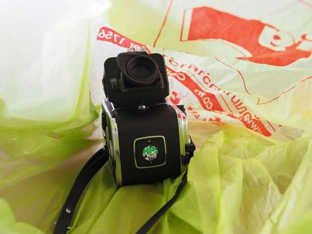 2. Coloque su cámara en la mitad izquierda de la bolsa de plástico. La razón de esto es porque se necesita espacio en el derecho a introducir su brazo para centrar el Hasselblad.