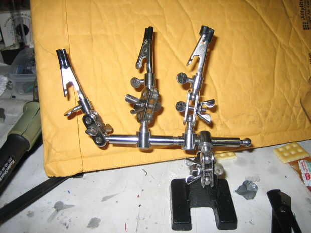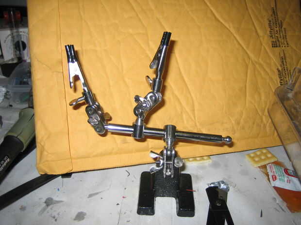 esto es una respuesta de "hacer su helping manos 100 x más útil para soldar y pegar pequeñas piezas". Tomé las mejoras leevonk y algunos de mi propia incluyendo la adición de calor retráctil al final de todos los tornillos y dentro de las manos