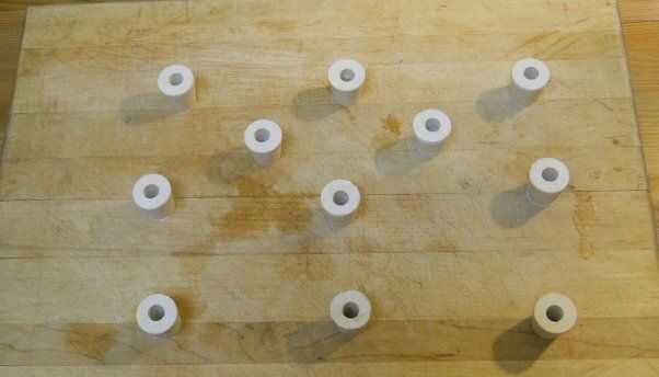 Extienda tus stoppers sobre una superficie plana. Si no vienen con los agujeros, perforar agujeros en ellos. Ser generosos acerca de tamaño del agujero.