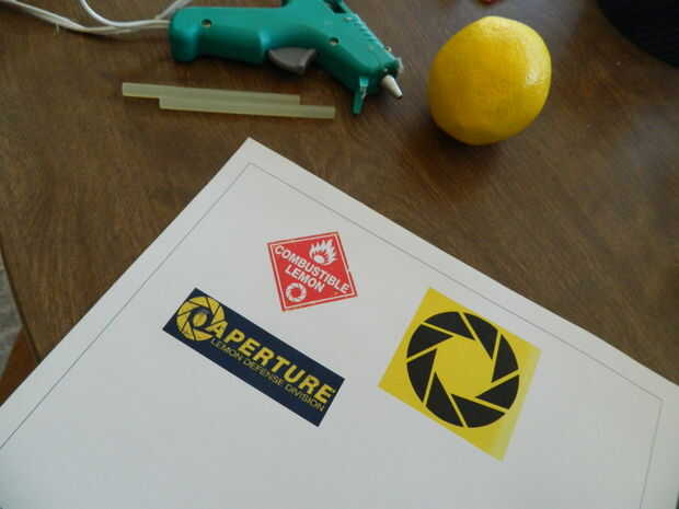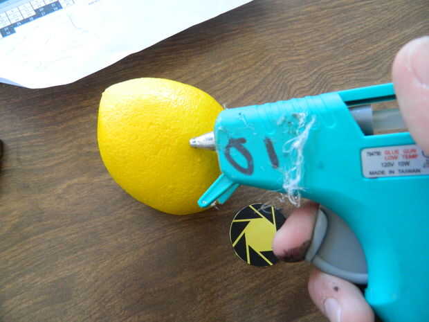Print out your decals. Usted puede hacer su propia o mina imprimir desde Powerpoint he subido.  Mina había aplicado con pegamento caliente pero tal vez podría usar Modge Podge para ponerlos en. Luego pegamento caliente le parte superior de la Granada en. Aplica pegamento caliente en la parte inferior de la parte superior de la Granada y presionar el limón real duro. Poner el pin en el y tienes tu limonada terminado!