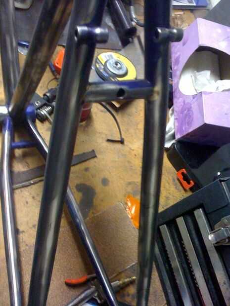 En este paso un cuidadosamente cortado de las piezas soldadas en que guían el cable de freno trasero para montar los frenos traseros. Esta moto realmente había frenos Cantilever tuvo también un pequeño tubo que envuelve el tubo del asiento que quité también. Usé mi dremel con un disco de corte para la mayor parte de la obra y mi amoladora angular 41/2" con un disco de lija para limpiar los restos.