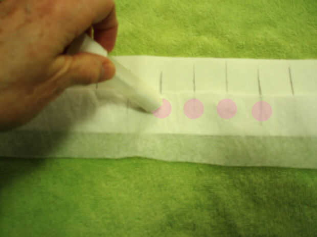 Estoy utilizando espaciamiento de la pulgada para estas semillas de claytonia.   Hacer una pequeña línea de pegamento en los lugares 5 a 8.  IMPORTANTE---pegamento solamente como muchos espacios que puede llenar con semillas y cubrir antes de que el pegamento se seca!.  (Mi palillo del pegamento no es color de rosa. Los puntos rosados fueron photoshopped en demostrar)