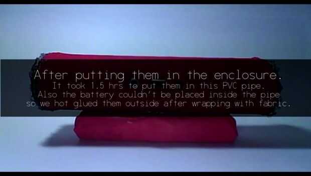 Después de completar la electrónica puede poner todo en el recinto del altavoz. Nos tomó 1,5 horas para hacerlo. Y hasta tuvimos que poner la batería fuera debido a la falta de espacio. Nosotros también caliente habían pegado cierto acoplamiento del alambre de valla de jardín a los altavoces. Por fin estaba buscando muy lindo y suena muy grande.