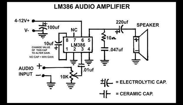 Este proyecto está inspirado en LM386 Mono Amplificador de Dean Sergovis de HackAWeek. Vamos a empezar haciendo primero su circuito básico. Se puede ver el esquema de arriba para hacer su circuito.
