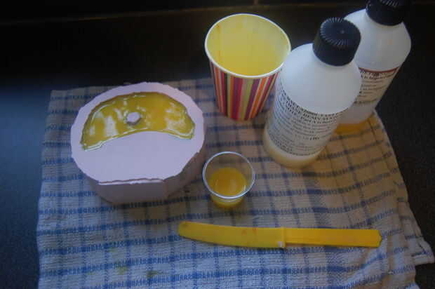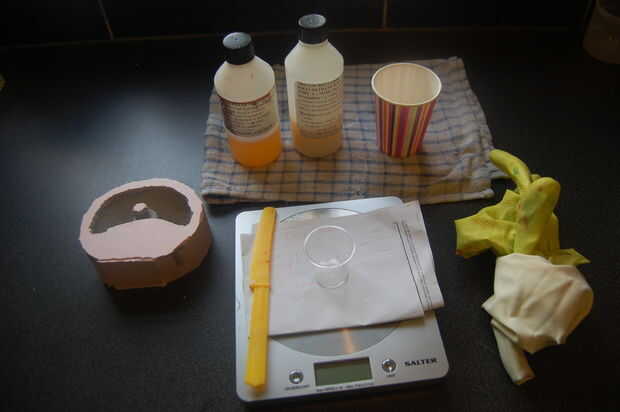Utilicé un método similar con las lentejas para medir el volumen de la PU necesaria. Pesaba la cantidad de lentejas que necesitaba para llenar la bodega y dividido por dos, luego vierte esta cantidad a la mitad un plástico pequeño vaso; este asimiento había utilizada casi dos vasos enteros. Luego poner mi taza de papel sobre la báscula de pesaje y vierte dos vasos de la parte de endurecedor de la PU y anotado el peso. Mezclé en mi colorante asegurándose de que estaba bien mezclado y luego se vierte en el mismo peso de la segunda parte PU. Mezcle muy bien y vierta le molde. Entonces todo lo que tienes que hacer es sentarse y relajarse durante media hora a una hora hasta que se establezca.