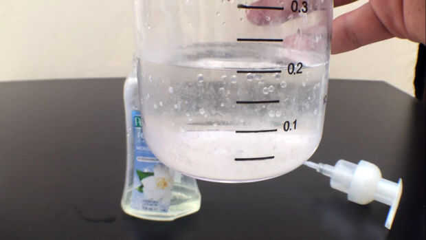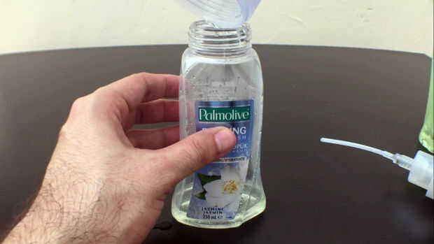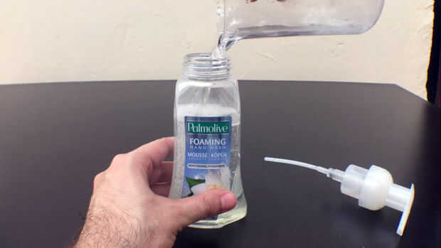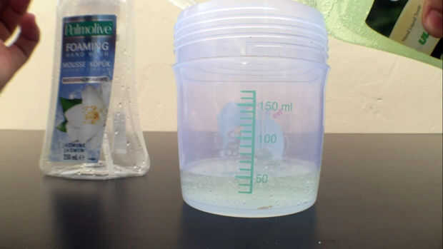 1-mezclar 50ml de jabón líquido con 200 ml de agua normal del grifo (puede utilizar agua destilada si quieres). Estamos haciendo como solución de 250 ml ya que es el tamaño del envase que hace espuma.