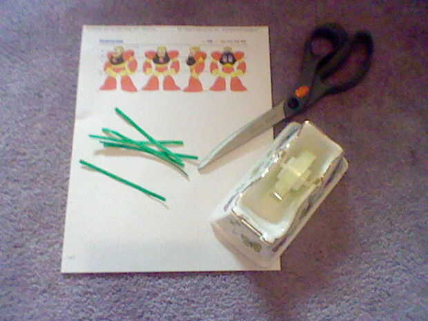 1.tin, limpiapipas, cinta adhesiva y tijeras2.make la lata en una bola y poner los agujeroscon unas tijeras en la lata. luego poner limpiadores de tubos en los agujeros para las piernas y brazos3. cada parte en cinta de enmascarar la deformación lueg