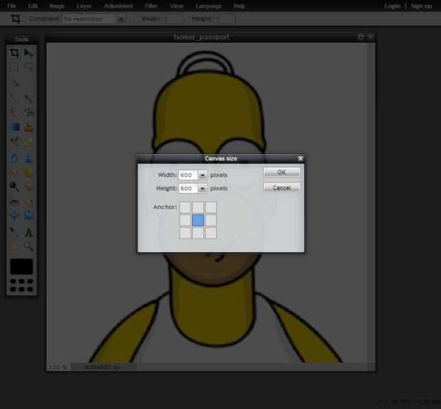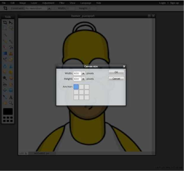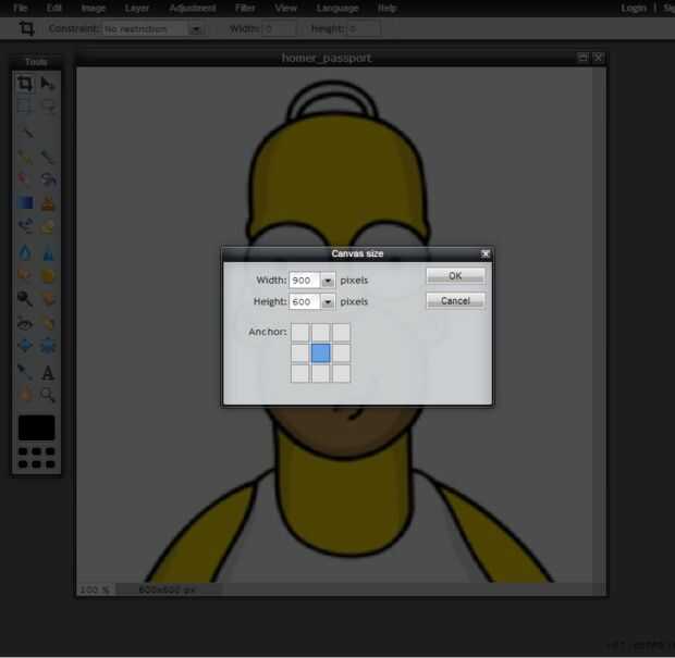Para este trabajo, he utilizado el editor de Pixler.com libre. Carga la imagen en Pixler "avanzada" editor, seleccione "imagen" en la barra de herramientas, seleccione "tamaño de lienzo" para cambiar la anchura de 600 a 900. Esto le dará el espacio inútil en los lados para adaptarse a una imagen de carpeta tamaño 2 "x 3". Guardar este archivo de 900 x 600 resultante en tu disco duro.