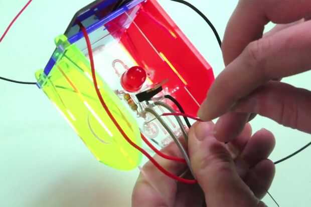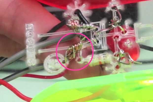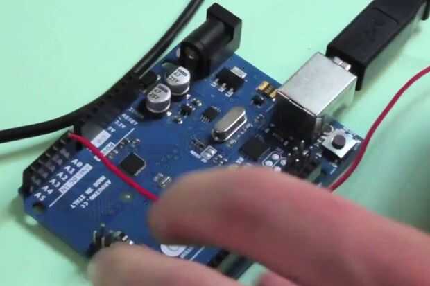 Para ello, pase el cable de puente por la parte delantera de la planta de sed, por el agujero marcado con el símbolo de unos y ceros. Entonces tuerza los cables en la parte posterior. Conecte el otro extremo de este cable (rojo) al Pin analógico 0 en su Arduino.