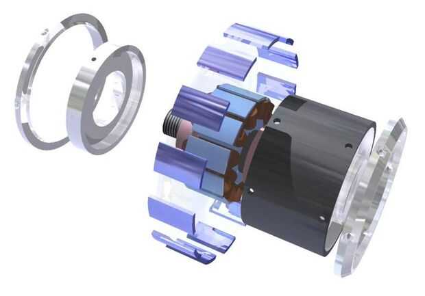 Debajo está un diagrama esquematico de un motor prototipo que estoy en el proceso de diseño y construcción. Vamos a aclarar algunos de la nomenclatura y vocabulario inmediatamente. La puede (o carcasa) Sostenga un arreglo circular de imanes (eléctricamente denominada polos) y se apoya en uno o ambos extremos por tapones. Todo este conjunto de rotación es el rotor. Internamente, el estator es una pieza especialmente en forma de piezas de hierro laminado (la pila) que tiene bobinas (o bobinas) de vueltas de alambre magneto en sus proyecciones (dientes). Está rígidamente montado en el eje (un eje nonrotating) que también asientos de los rodamientos para el montaje del rotor.