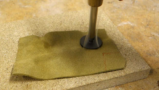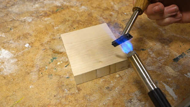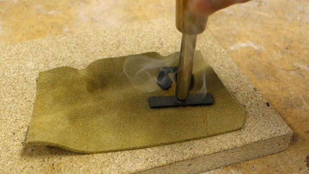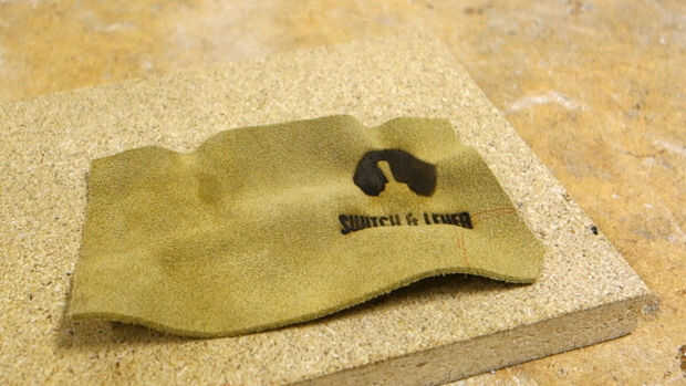 Agarra un soplete y caliente la marca. Vas a tener que experimentar un poco con lo caliente que desea llegar su marca, cuánto tiempo debe mantenerse en contacto con el material, etc.. Diferentes materiales reaccionan diferentemente al calor. Por ejemplo, el cuero de la imagen contratada un poco, que requieren humedecer y suavizar para recuperar su forma.