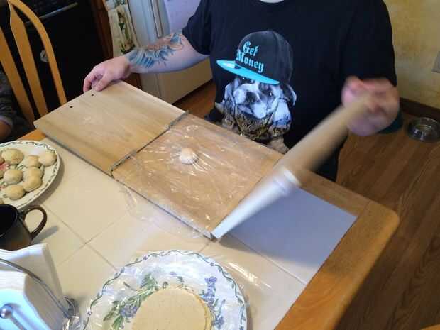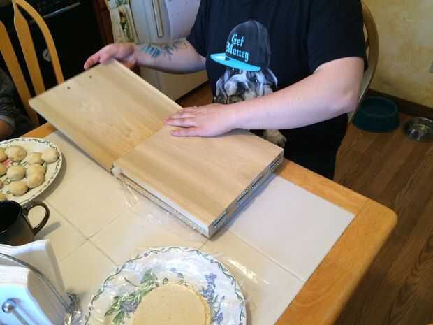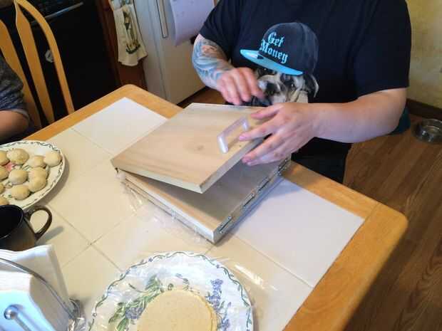 A partir de ahí no sale nada más fácil, más cerca, la capa media, entonces cierre la parte superior. El peso de la madera presionará la tortilla.