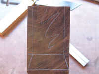 Utilizando un gramil en 8mm, marque los bordes frontales y la cara superior de la garganta a ambos lados. Estos son los pilares para la cuña. En la cara superior dibuja una línea diagonal desde el borde frontal (8mm a) volver al frente de la garganta. En el punto de encuentran de los dos ángulos en el lado de la garganta, marque esta altura a lo largo de la parte delantera. Hacer una línea diagonal desde esta altura hacia fuera a los lados del bloque, parando 3mm para arriba, Foto 3. Esto completa el diseño.